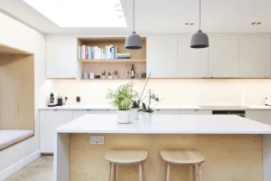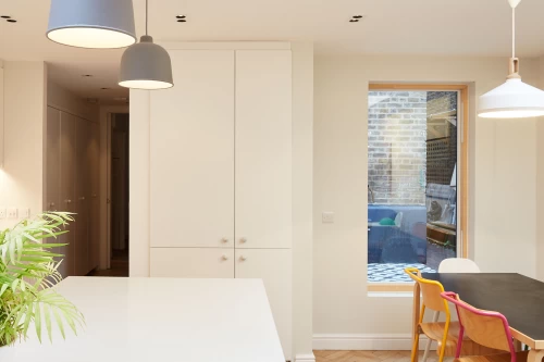 Despite the generous size of the property, an extension was required to provide a new open-plan kitchen, dining & living hub. The new wraparound extension was designed to retain a large rear courtyard which had dual purpose: firstly the courtyard allowed a generous amount of daylight and natural ventilation into the new dining area, existing rear reception/ study room and the new downstairs shower room and utility zone. Secondly, as the property is end-of-terrace a side access from the street already existed, therefore the rear courtyard allowed a second access point at the centre of the ground floor plan. Around this entrance are located a new cloaks area, ground floor WC and shower room, together with a large utility zone providing most of the utilities and storage requirements for the property.