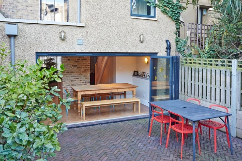 The existing basement had a particularly low ceiling height, and the space was disrupted by a number of structural walls. The main intent at this level was to open the space up as much as possible, whilst also working within the existing head height and structural constraints in order to produce an efficient/ relatively low-cost intervention. The space was required to provide a new-open plan kitchen and dining hub with improved views of and access to the rear garden, a new family living room, and a utility zone housing the laundry appliances and general household storage. A full height 3-panel bi-fold door system is used to maximise light into the basement and also maximise views of the newly finished garden and surrounding context of Church Street and Abney Park Cemetery.