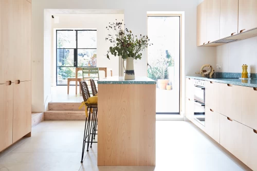 Our typical palette of materials and standard products are used throughout but are also complemented with some bespoke elements including: HØLTE kitchen fronts & bespoke joinery, Fabco Sanctuary steel framed patio doors and Diespeker & Co. terrazzo worktops.